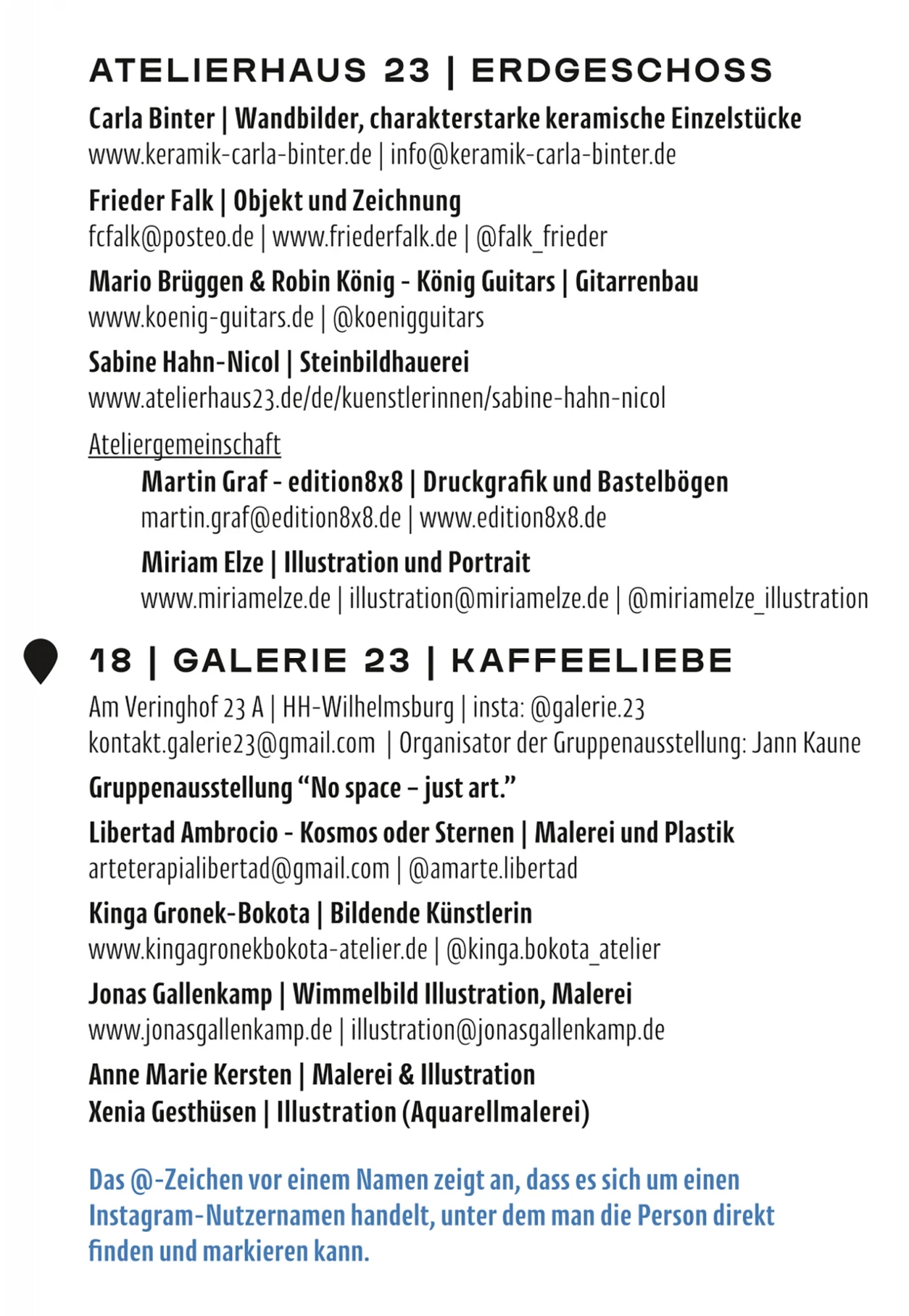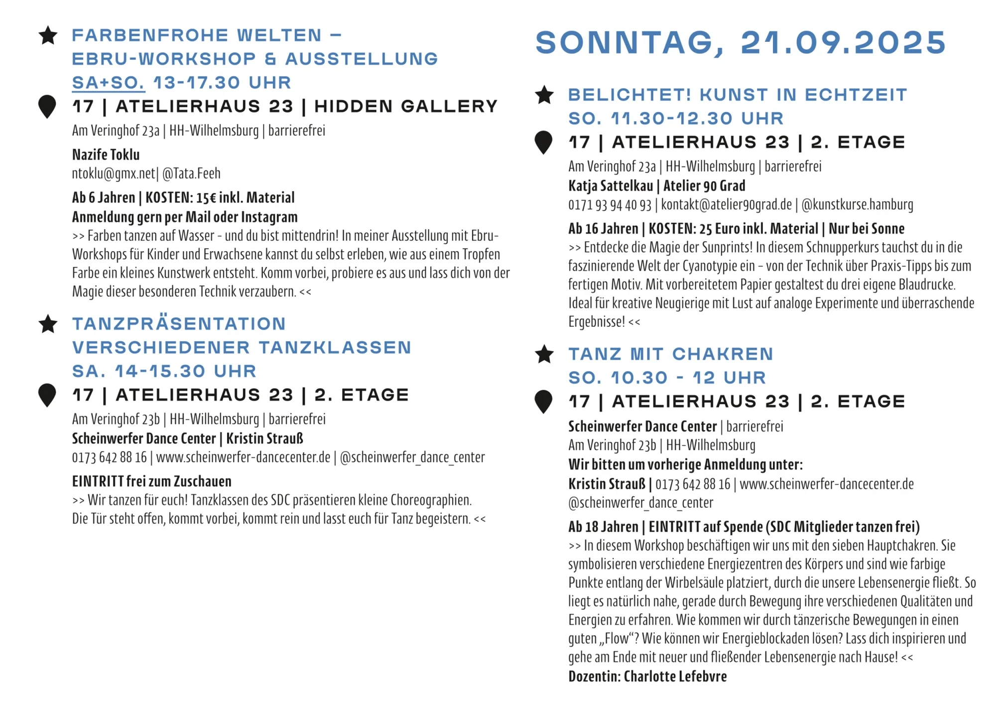 Am Wochenende des 20. und 21. September 2025 lädt das Atelierhaus 23 gemeinsam mit über 100 Künstlerinnen, Kreativschaffenden, Performerinnen und Kulturorten zu den 13. Kunst- und Ateliertagen auf der Elbinsel Wilhelmsburg ein. Besucher*innen erwartet ein buntes, interaktives und vielfältiges Programm in Ateliers, Werkstätten, Gärten und Kulturhäusern von der Veddel bis Georgswerder.