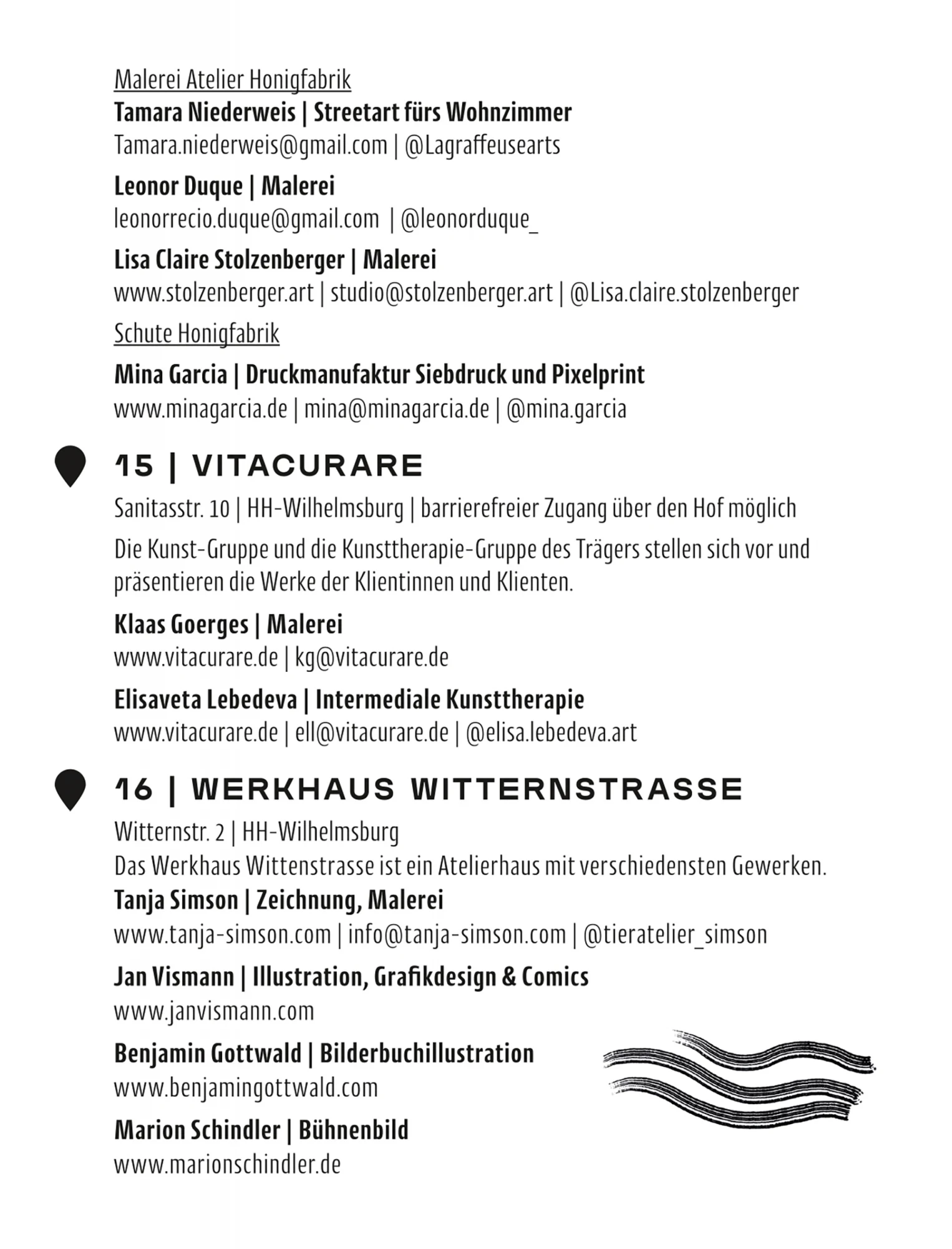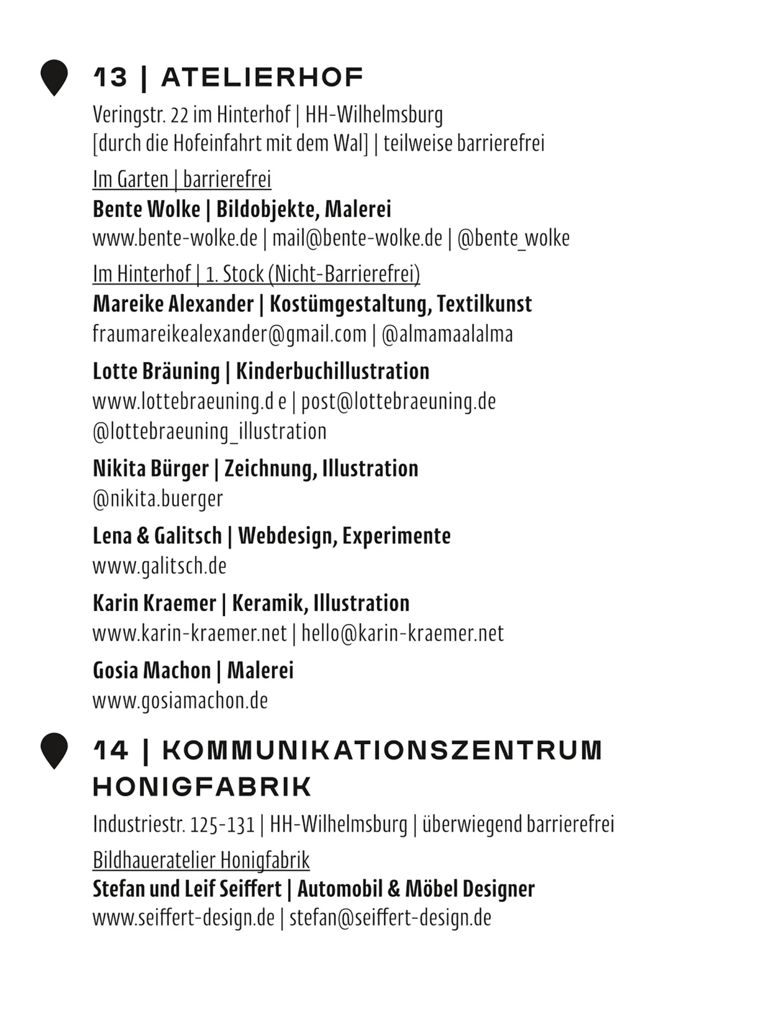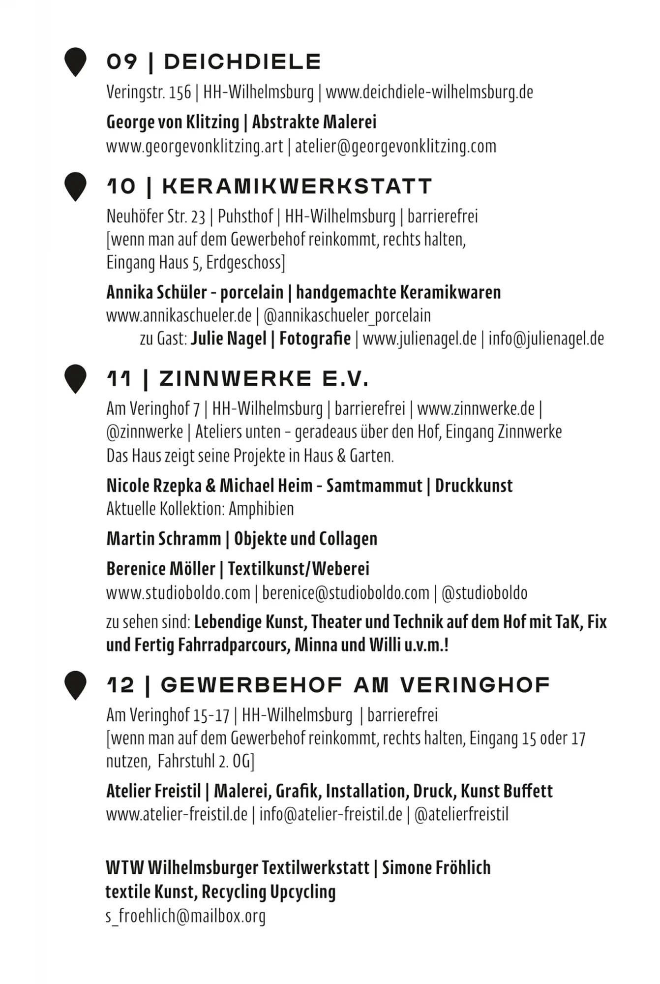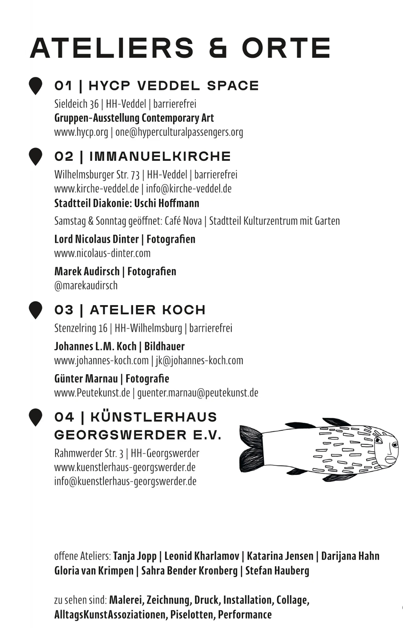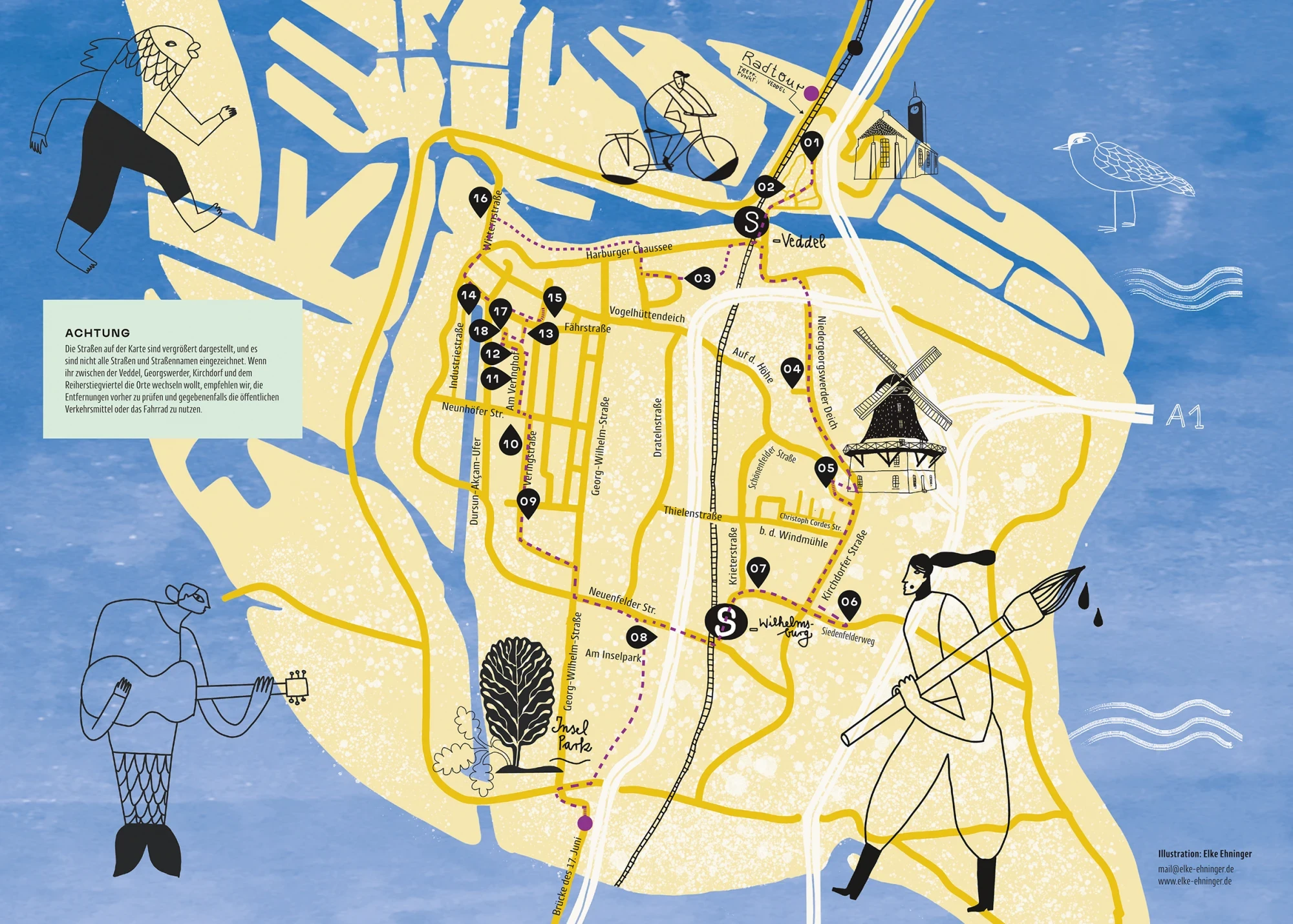 Die Kunst- und Ateliertage lassen sich besonders gut mit dem Fahrrad erkunden – eine eigens ausgearbeitete Spätsommer-Radtour verbindet die vielen Stationen zwischen Reiherstiegviertel, Kirchdorf, Georgswerder und der Veddel. Der Flyer mit Karte liegt in den teilnehmenden Ateliers aus und steht digital unter www.kunstundateliertage.de zur Verfügung.