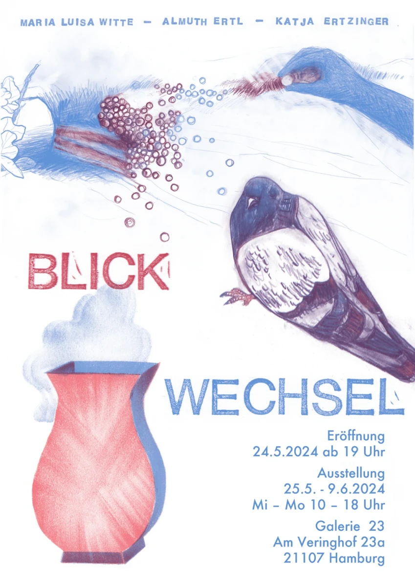 Die Ausstellung „Blickwechsel“ vereint Arbeiten der drei Hamburger Künstlerinnen Maria Luisa Witte, Almuth Ertl und Katja Ertzinger im Spannungsfeld von realistischer Darstellung und abstrahierender Zeichnung.