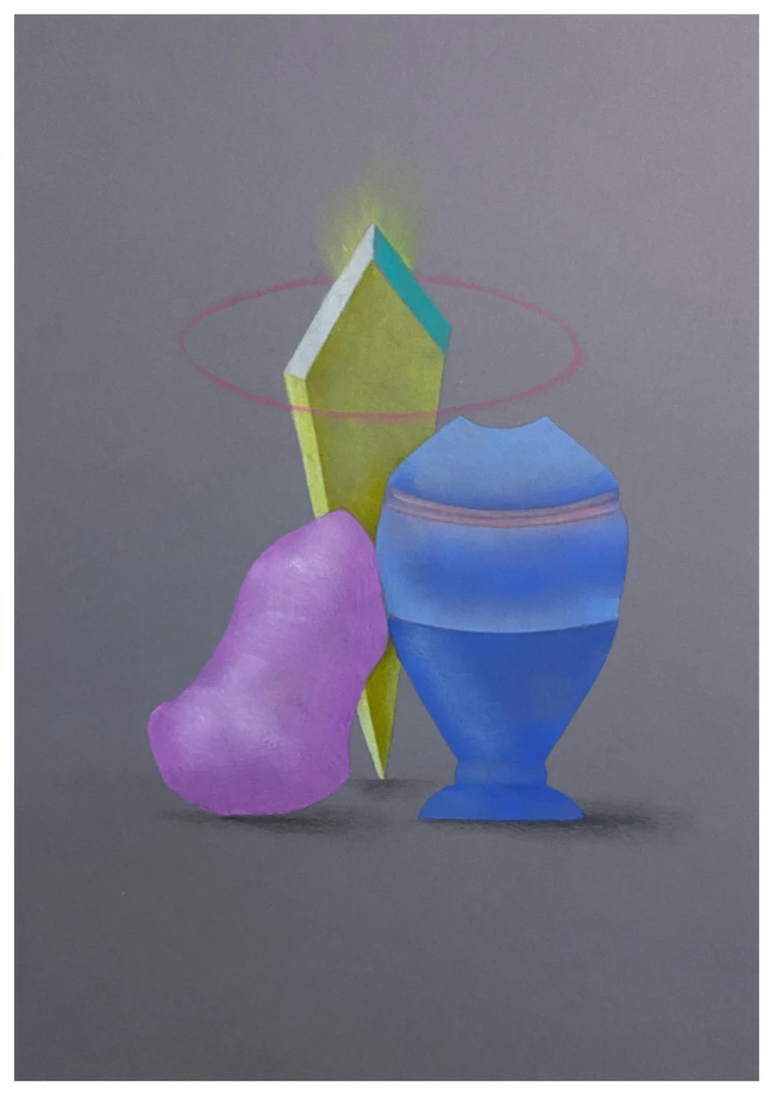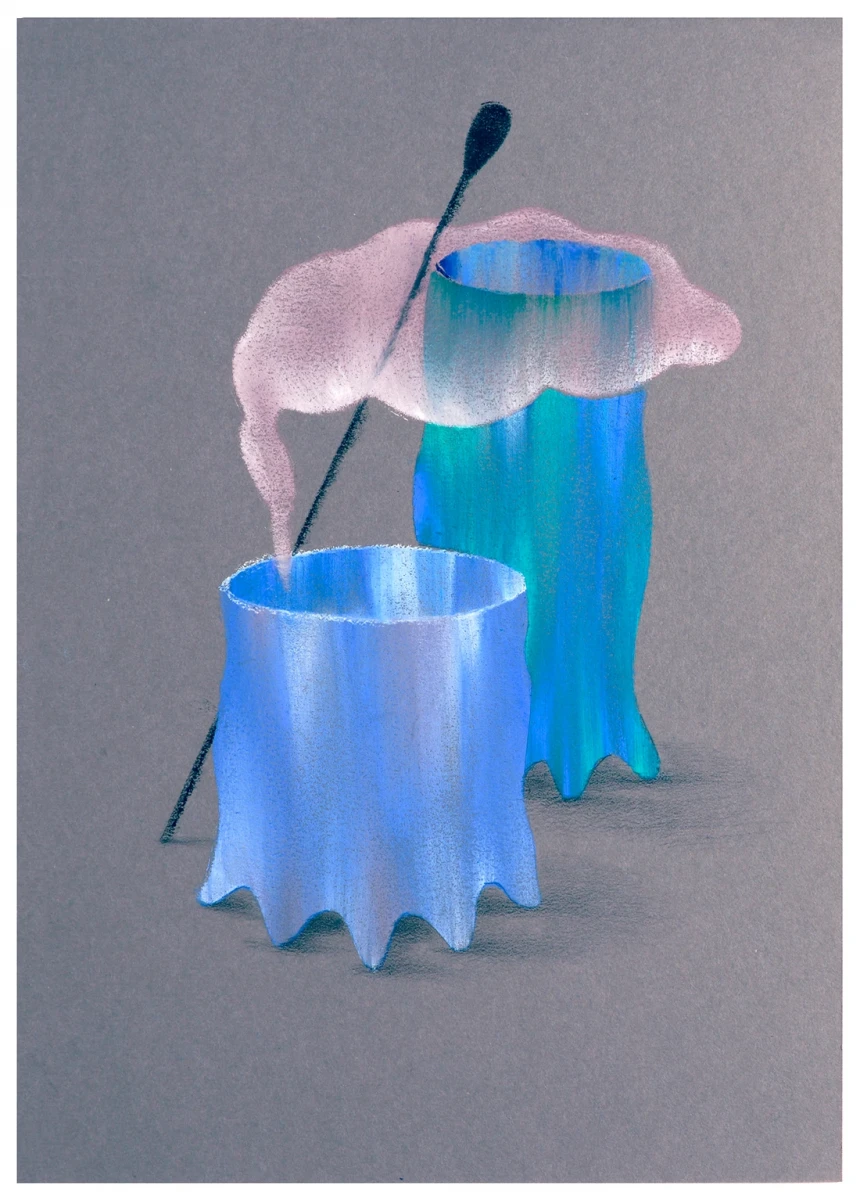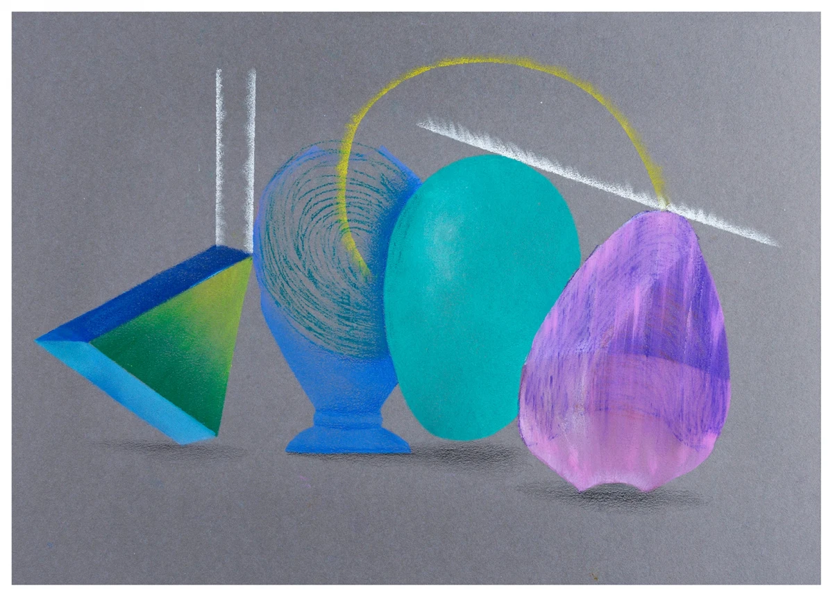 Während hier der realistische Blick auf die Landschaft und das vor Ort Erlebte im Vordergrund steht, kombiniert Katja Ertzinger in ihren Stillleben-Zeichnungen abstrahierte Gefäße mit anderen Objekten und untersucht das Verhältnis von Natur und Kultur sowie das Wechselspiel von innen und außen.