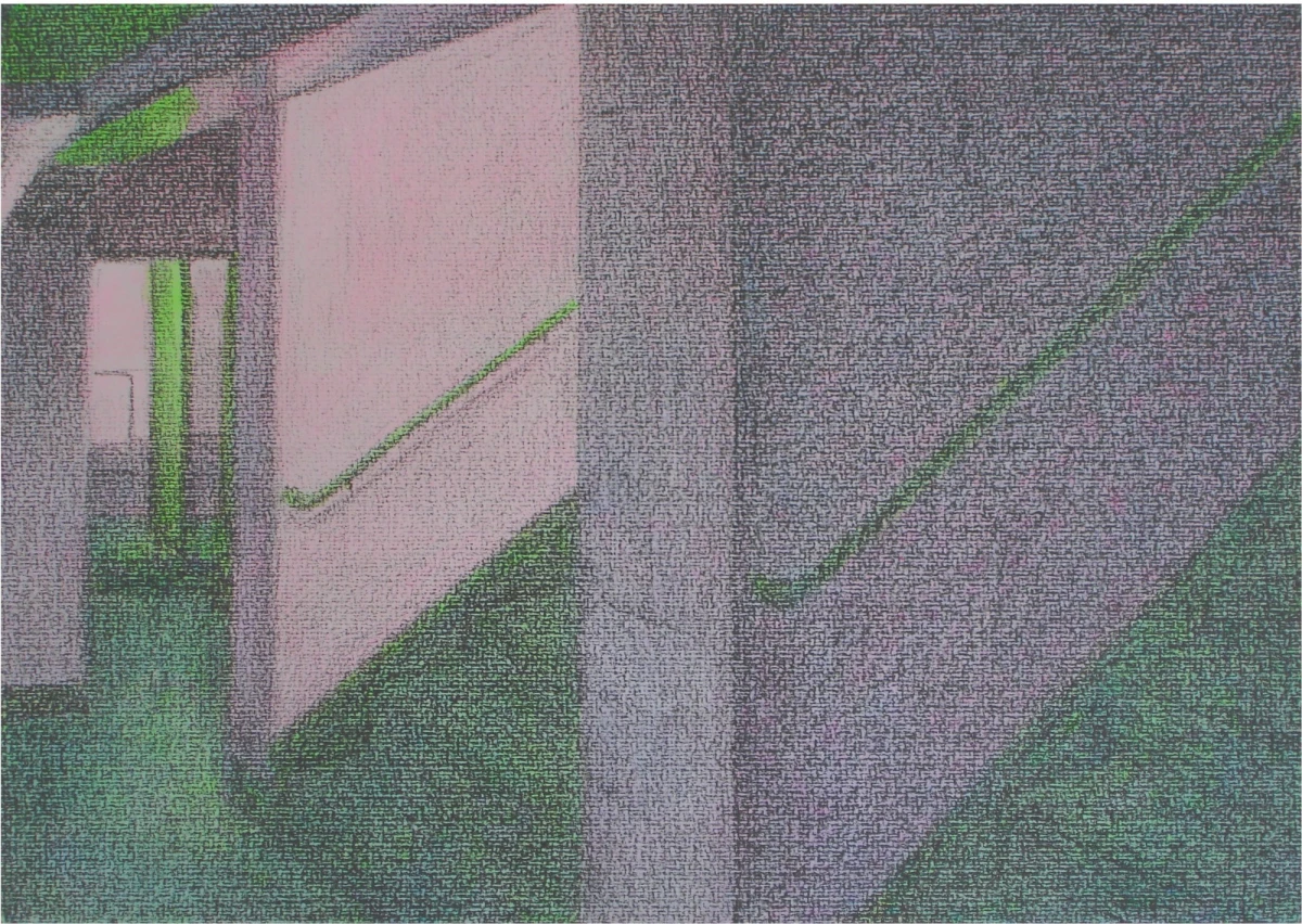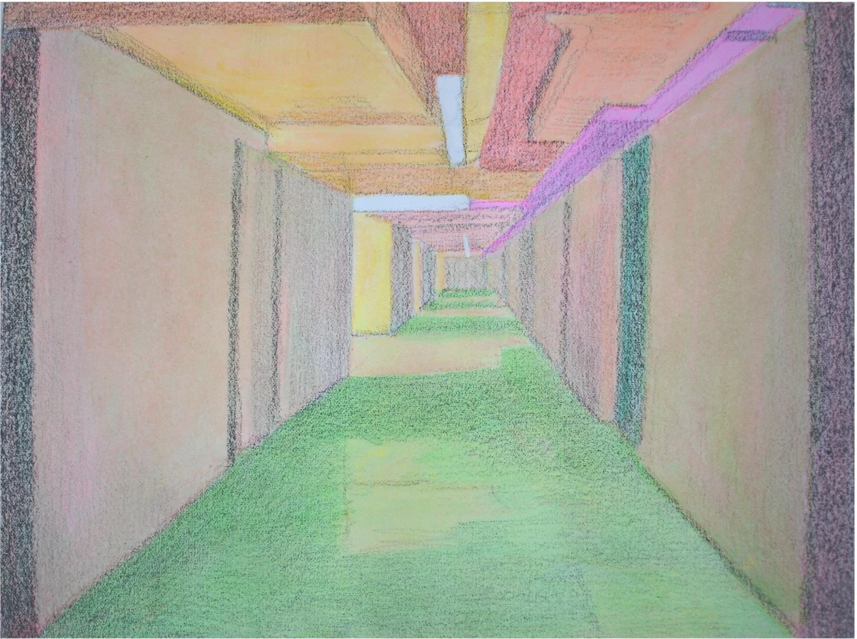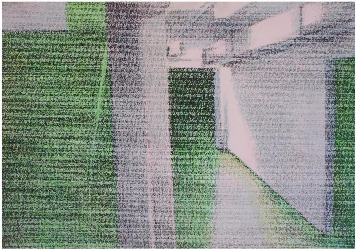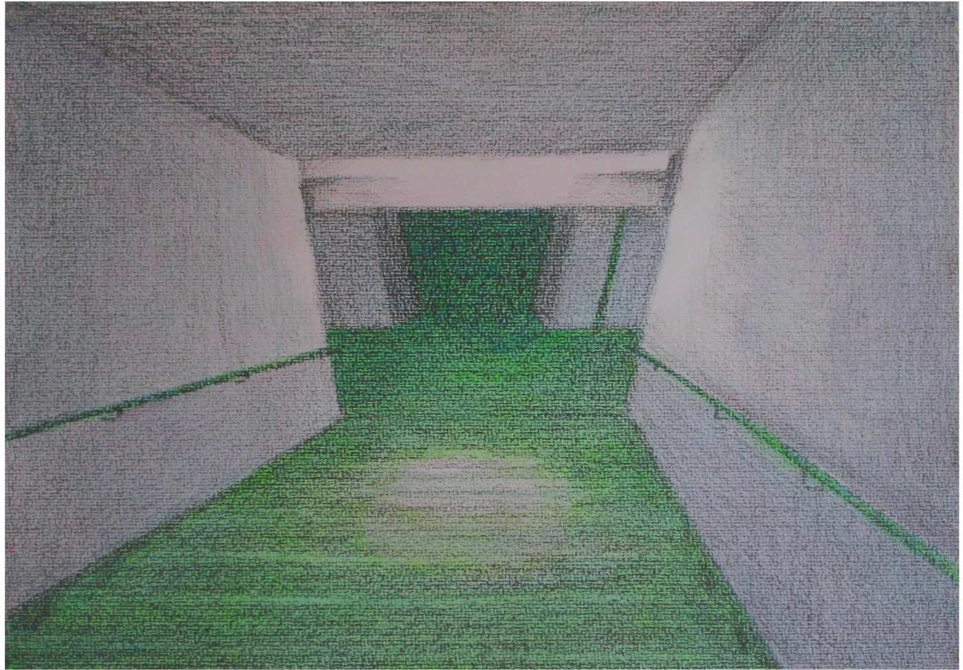 Im Zentrum stehen neonfarbige Kreidezeichnungen aus dem unterirdischen Hilfskrankenhaus in Wedel, in den 60er Jahren gebaut für die Versehrten eines möglichen Atomkrieges.