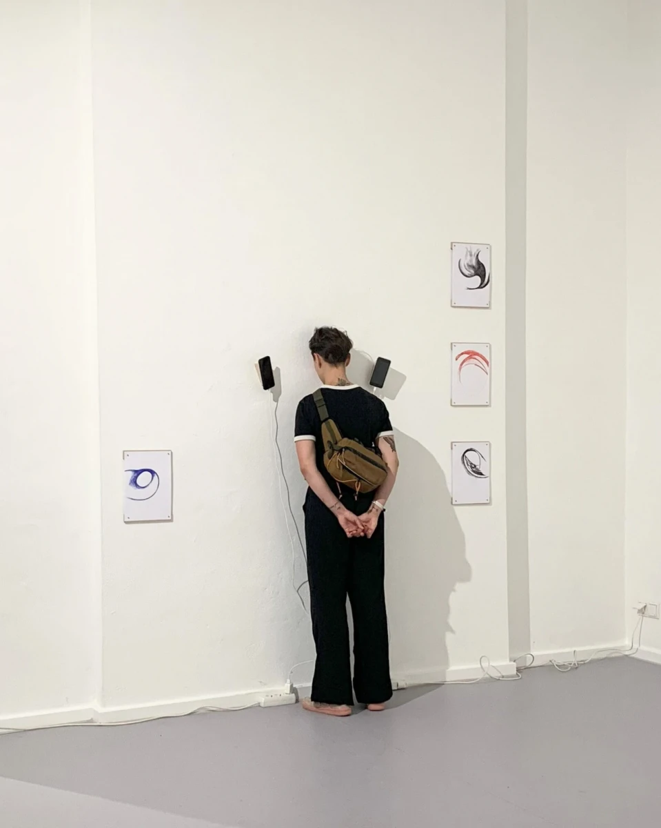 Zoé Champagne (1996, Hamburg/Paris) verbindet in deren interdisziplinären Arbeiten künstlerische Praxis mit kulturwissenschaftlichen Analysen. Die Soundinstallation in der Ausstellung basiert auf intimen Gesprächsspuren und Zeichnungen aus (Fern-)Freundinnenschaften, die als zarte Bündnisse gegen gesellschaftlichen Druck gelesen werden können. Champagne hat Politikwissenschaft in Paris sowie Kulturwissenschaft in Bremen und Paris studiert und ist als Drag-Performer*in „Coucou Cherry“ Teil des Kollektivs NipSlips.