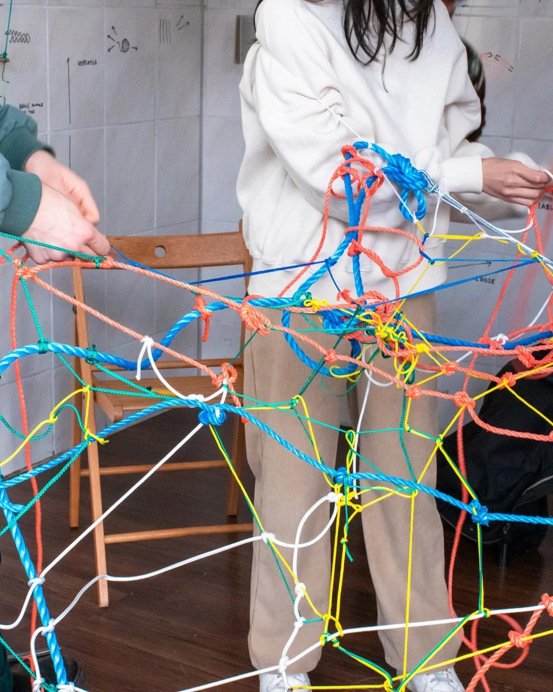Die Ausstellung lädt Besucher*innen dazu ein, Teil eines offenen, wachsenden Archivs zu werden. Sie können Gedanken, Skizzen und Beiträge hinterlassen – oder direkt an den gespannten Netzen weiterknüpfen, die als Metapher für menschliche Verbindungen und ihre Belastbarkeit dienen.