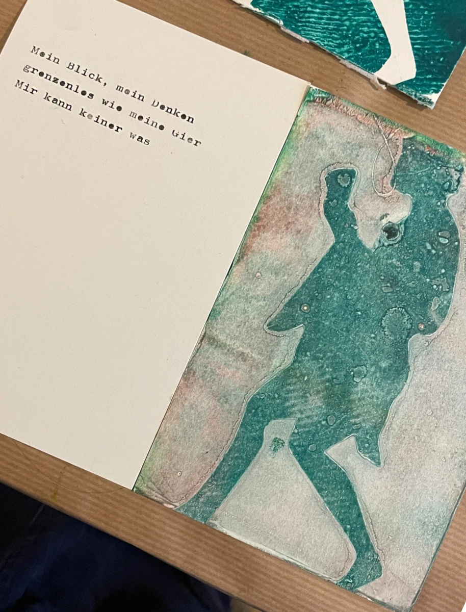 Wir experimentieren mit Techniken des kreativen Schreibens und entwickeln kurze Texte im Zusammenspiel mit Drucktechniken und Papiercollagen. Am Ende des kompakten Workshops fügen wir die entstandenen Arbeiten zu einem kleinen Leporello zusammen.