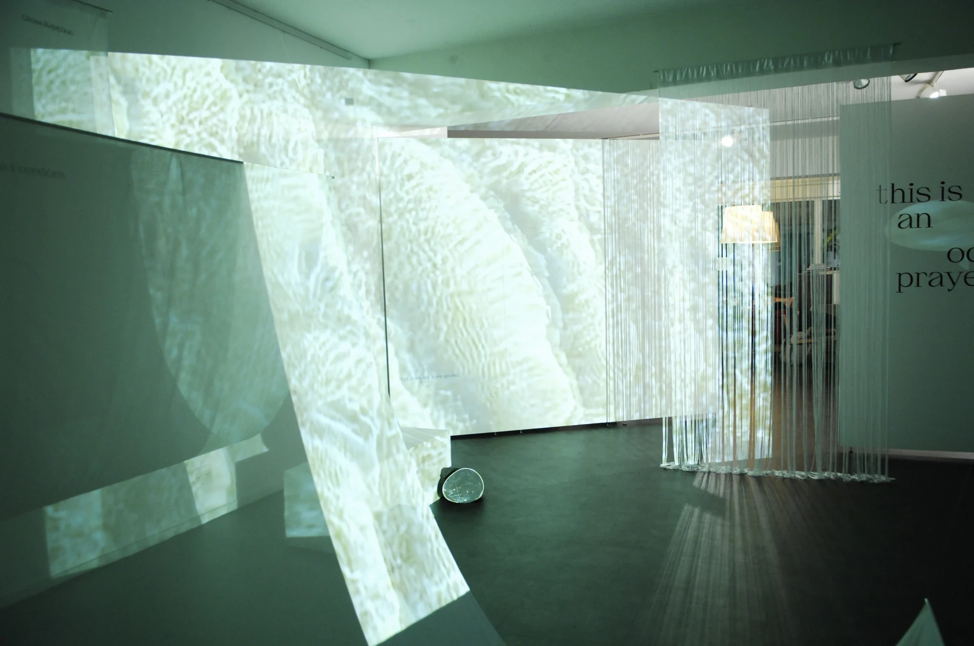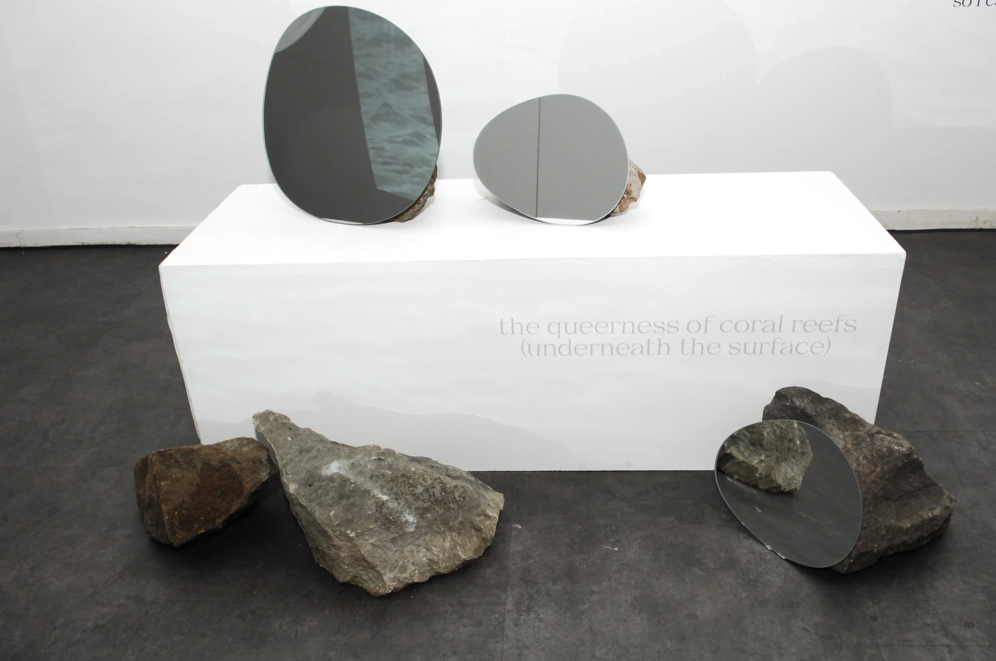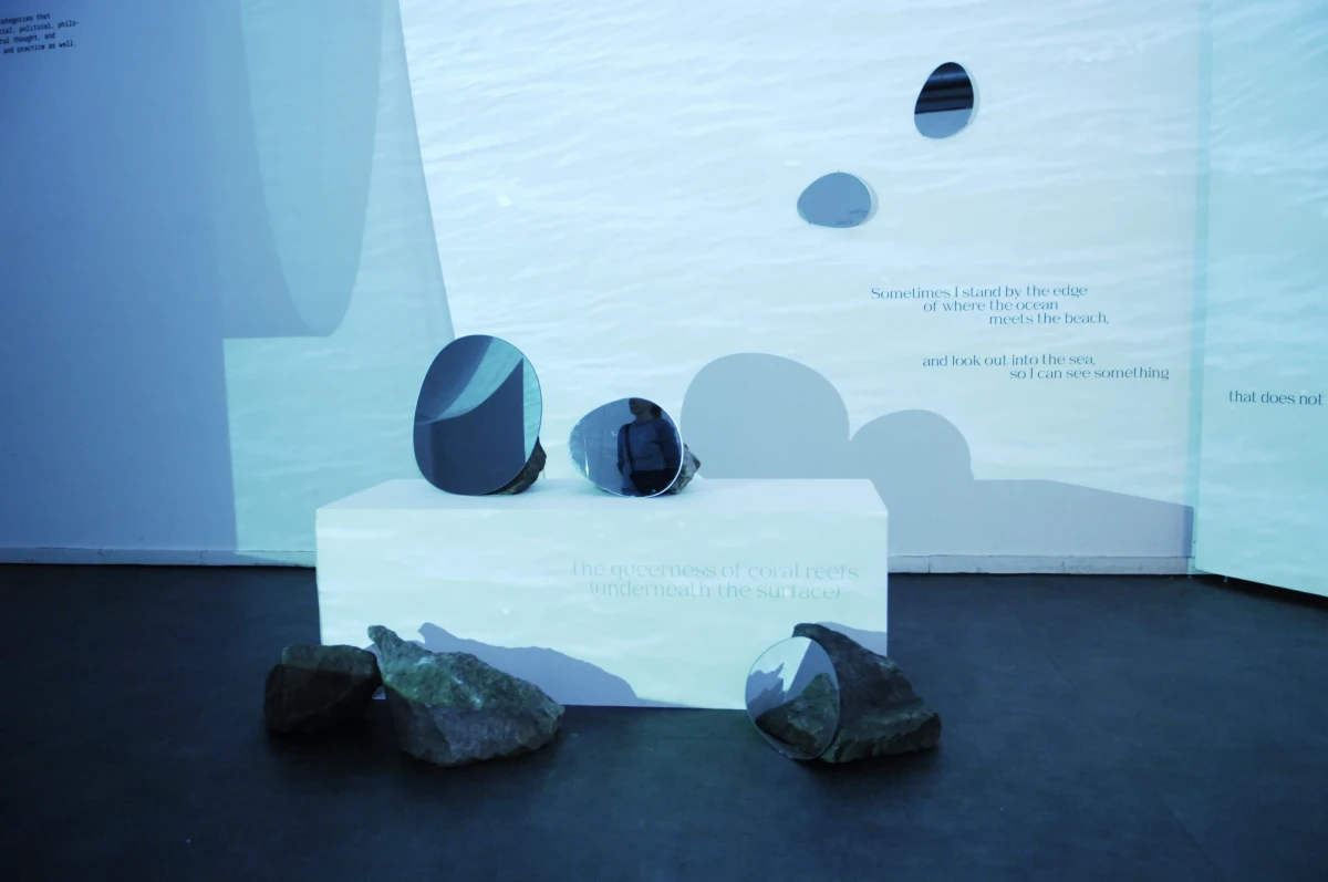 Installation und Booklet. Wie spricht der Ozean zu dir? Was hörst du? Was hörst du nicht? Schönheit, Angst, Sehnsucht, Lebendigkeit und Tod. Alles gleichzeitig? In einer Sammlung aus Text und Bild erfoscht die Arbeit das Meer: welche Überlappungen entstehen? Woher kommen sie? Und wie können die Gleichzeitigkeiten des Ozeans uns dabei helfen, (Macht)strukturen aufzulösen und Offenheit zu kultivieren? Bewegtbild, Spiegel, Mesh, Siebdruck, Wellentexte, Salz. »the sea is not a question of power/this is an ocean prayer« öffnet einen Raum: dies ist eine Einladung, einzutauchen.