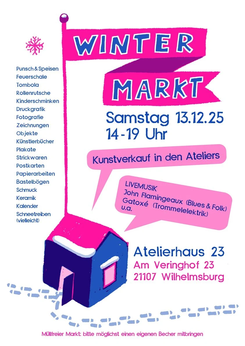 Am Samstag, den 13.12.2025 von 14-19 Uhr laden wir euch wieder herzlich zum Atelierhaus 23 Wintermarkt ein!