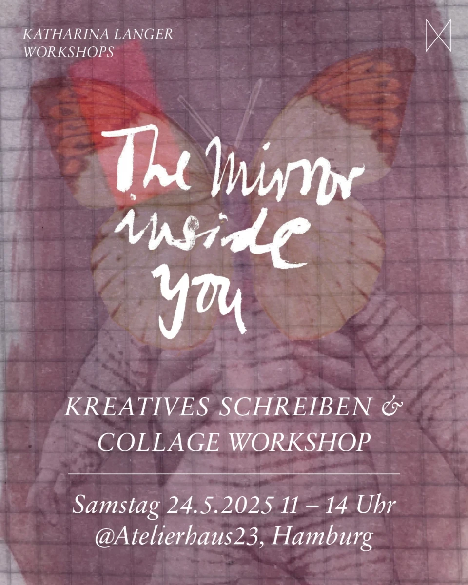 Am 24. Mai gibt Katharina Langer in ihrem Atelier im Atelierhaus23 einen Frühlingsworkshop Kreatives Schreiben & Collage. Thema dieses Mal ist „The Mirror Inside“ – eine Reihe kreativer und reflektierender Schreibübungen rund um Erinnerungen, innere Reflexionen und Träume. Im zweiten Teil des Workshops werden die Teilnehmer*innen ihre geschriebenen Textfragmente durch das intuitive und expressive Medium der Papier-Collage zum Leben erwecken.